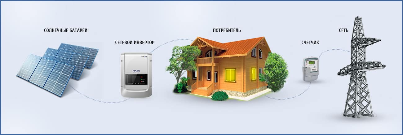 Сетевая солнечная электростанция состоит только из солнечных модулей и сетевого инвертора - аккумуляторы не требуются. В СЭС используется метод прямого преобразования солнечного излучения в электрическую энергию с ее последующей подачей в вашу электросеть. Система предназначена для уменьшения потребляемой энергии от центральной электросети, а также увеличения ее суммарной мощности. СЭС работает одновременно с вашей сетью, добавляя сгенерированную ею энергию на питание нагрузки.