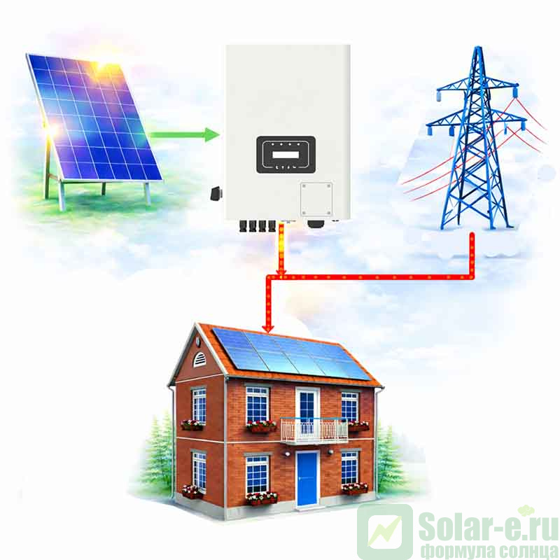 Сетевая солнечная электростанция состоит только из солнечных модулей и сетевого инвертора - аккумуляторы не требуются. В СЭС используется метод прямого преобразования солнечного излучения в электрическую энергию с ее последующей подачей в вашу электросеть. Система предназначена для уменьшения потребляемой энергии от центральной электросети, а также увеличения ее суммарной мощности. СЭС работает одновременно с вашей сетью, добавляя сгенерированную ею энергию на питание нагрузки.